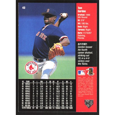This is a 1998 Upper Deck Tom Gordon baseball card. The card is #43 and pictures show condition.