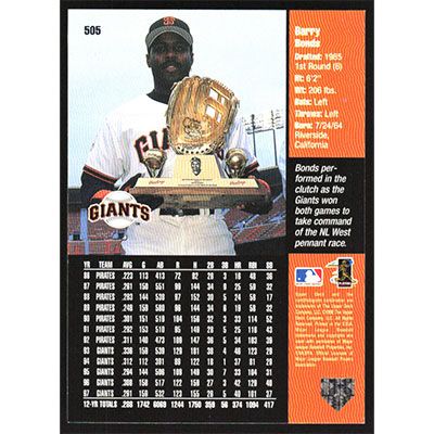 This is a 1998 Upper Deck Barry Bonds baseball card. The card is #505 and pictures show condition.