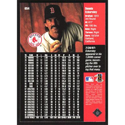 This is a 1998 Upper Deck Dennis Eckersley baseball card. The card is #654 and pictures show condition.