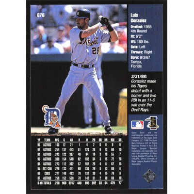 This is a 1998 Upper Deck Luis Gonzalez baseball card. The card is #676 and pictures show condition.