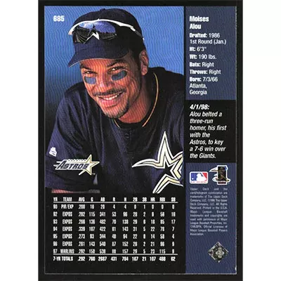 This is a 1998 Upper Deck Moises Alou baseball card. The card is #685 and pictures show condition.