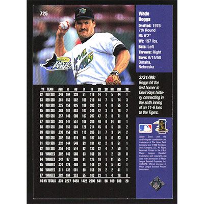 This is a 1998 Upper Deck Wade Boggs baseball card. The card is #725 and pictures show condition.