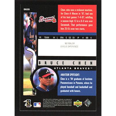 This is a 1998 Upper Deck Destination Stardom Bruce Chen baseball card. The card is #DS35 and pictures show condition.