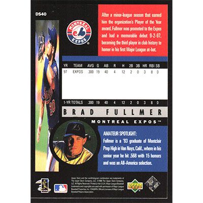 This is a 1998 Upper Deck Destination Stardom Brad Fullmer baseball card. The card is #DS40 and pictures show condition.