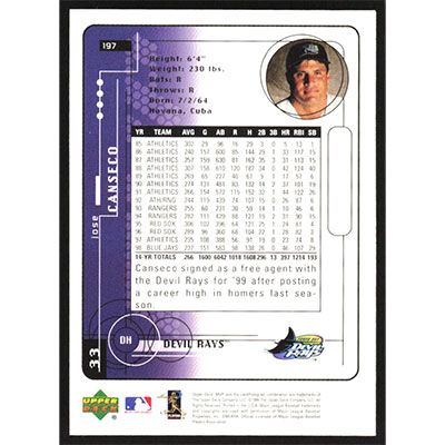 This is a 1998 Upper Deck MVP Jose Canseco baseball card. The card is #197 and pictures show condition.