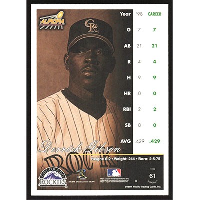 This is a 1999 Aurora Derrick Gibson baseball card. The card is #144 and pictures show condition.