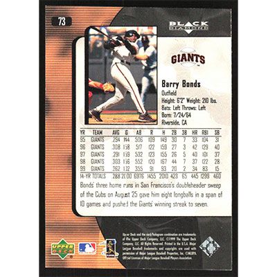This is a 1999 Black Diamond Barry Bonds baseball card. The card is #73 and pictures show condition.