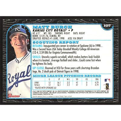 This is a 1999 Bowman Matt Burch baseball card. The card is #107 and pictures show condition.