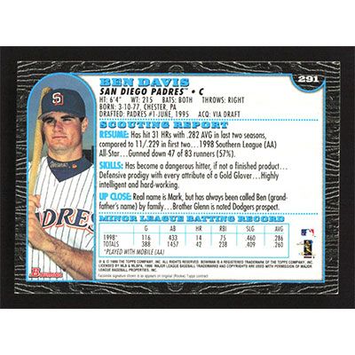 This is a 1999 Bowman Ben Davis baseball card. The card is #291 and pictures show condition.