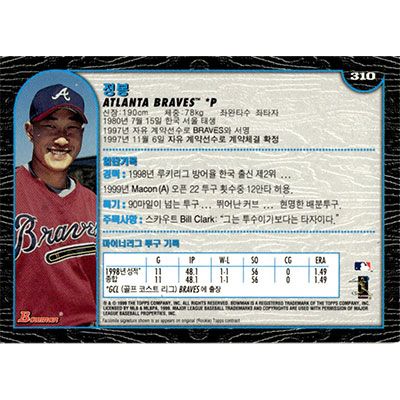 This is a 1999 Bowman International Jung Bong baseball card. The card is #310 and pictures show condition.