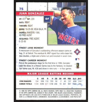 This is a 1999 Finest Juan Gonzalez baseball card. The card is #75 and pictures show condition.