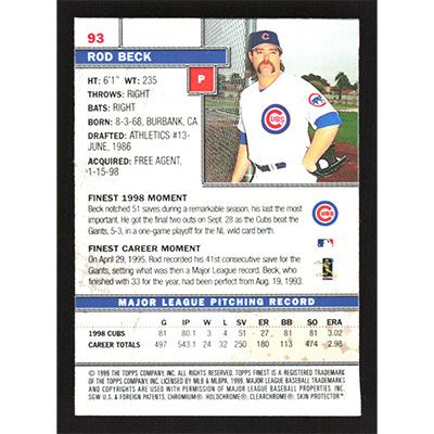 This is a 1999 Finest Rod Beck baseball card. The card is #93 and pictures show condition.