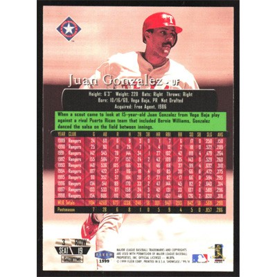 This is a 1999 Flair Showcase Row 3 Juan Gonzalez baseball card. The card is #19 and pictures show condition.