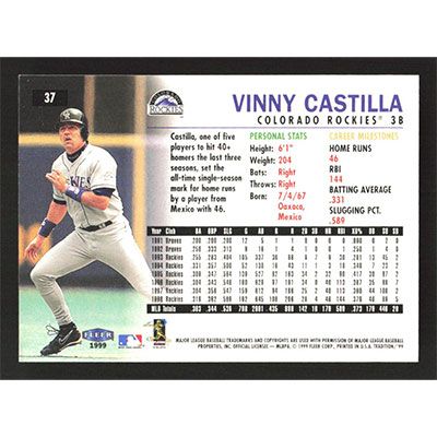 This is a 1999 Fleer Tradition Vinny Castilla baseball card. The card is #37 and pictures show condition.