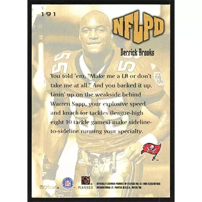 This is a 1999 Metal Universe Derrick Brooks NFLPD football card. The card is #191 and pictures show condition.