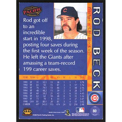 This is a 1999 Pacific Rod Beck baseball card. The card is #80 and pictures show condition.