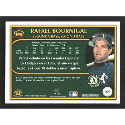 This is a 1999 Pacific Crown Collection Rafael Bournigal baseball card. The card is #199 and pictures show condition.