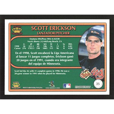 This is a 1999 Pacific Crown Collection Scott Erickson baseball card. The card is #35 and pictures show condition.