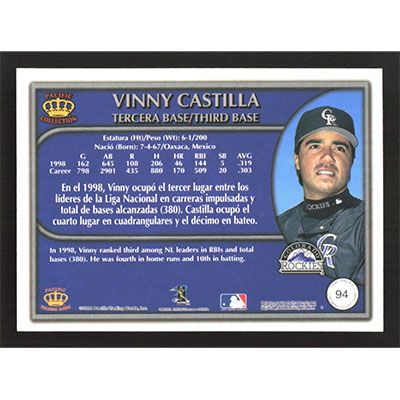 This is a 1999 Pacific Crown Collection Vinny Castilla baseball card. The card is #94 and pictures show condition.