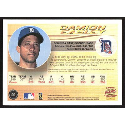 This is a 1999 Pacific Crown Collection Damion Easley baseball card. The card is #99 and pictures show condition.