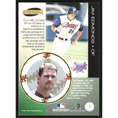 This is a 1999 Pacific Invincible Jim Edmonds baseball card. The card is #1 and pictures show condition.