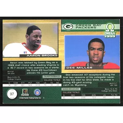 This is a 1999 Pacific Omega Aaron Brooks and Dee Miller football card. The card is #97 and pictures show condition. Team(s): Green Bay Packers Rookie Card (RC)