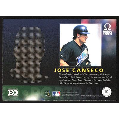 This is a 1999 Pacific Omega EO Portraits Jose Canseco baseball card. The card is #19 and pictures show condition.