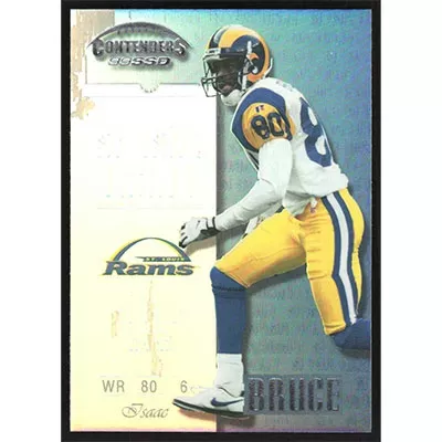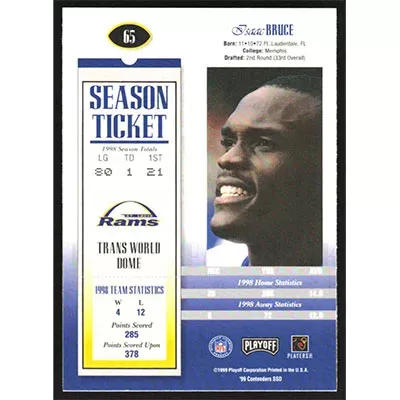 This is a 1999 Playoff Contenders SSD Isaac Bruce football card. The card is #65 and pictures show condition.