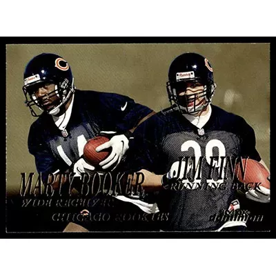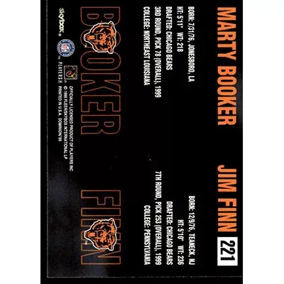 This is a 1999 Skybox Dominion Marty Booker and Jim Finn football card. The card is #221 and pictures show condition.