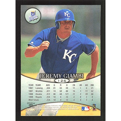 This is a 1999 SkyBox Molten Metal Jeremy Giambi Heavy Metal baseball card. The card is #126 and pictures show condition.