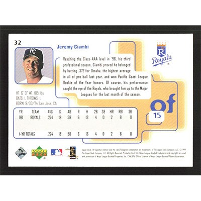 This is a 1999 SP Signature Edition Jeremy Giambi baseball card. The card is #32 and pictures show condition.