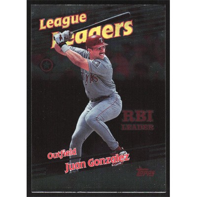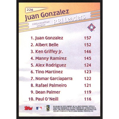 This is a 1999 Topps Juan Gonzalez League Leaders baseball card. The card is #226 and pictures show condition.