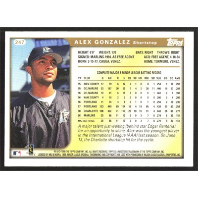 This is a 1999 Topps Alex Gonzalez baseball card. The card is #247 and pictures show condition.