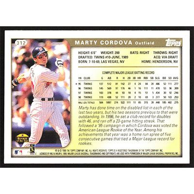 This is a 1999 Topps Marty Cordova baseball card. The card is #312 and pictures show condition.