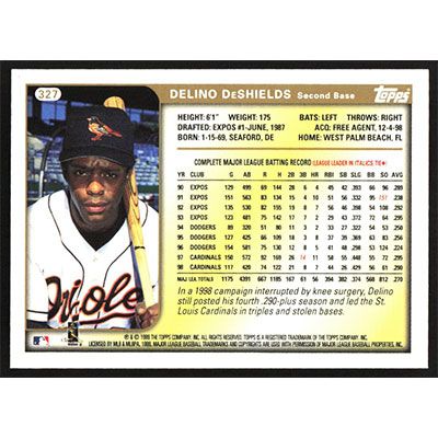 This is a 1999 Topps Delino DeShields baseball card. The card is #327 and pictures show condition.