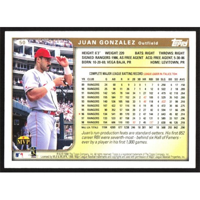 This is a 1999 Topps Juan Gonzalez baseball card. The card is #50 and pictures show condition.