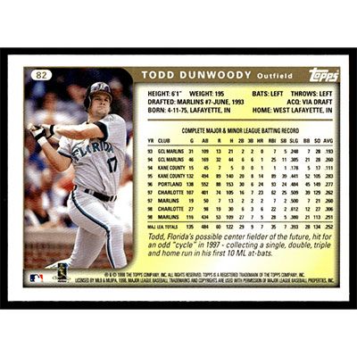 This is a 1999 Topps Todd Dunwoody baseball card. The card is #82 and pictures show condition.