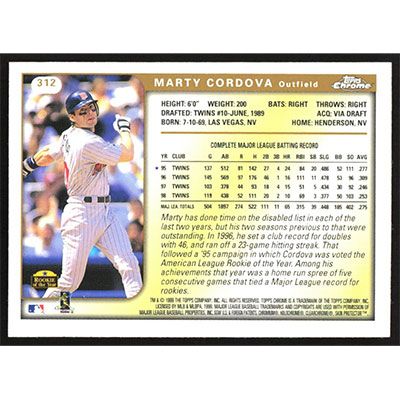 This is a 1999 Topps Chrome Marty Cordova baseball card. The card is #312 and pictures show condition.