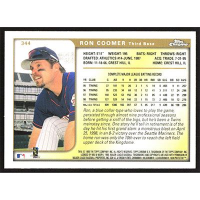 This is a 1999 Topps Chrome Ron Coomer baseball card. The card is #344 and pictures show condition.