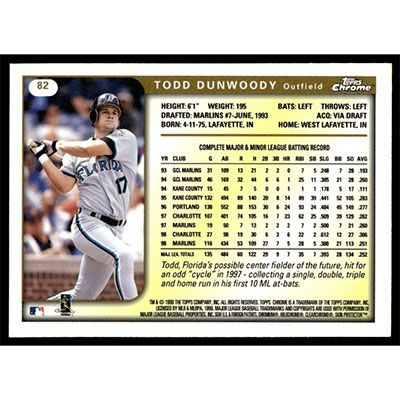 This is a 1999 Topps Chrome Todd Dunwoody baseball card. The card is #82 and pictures show condition.