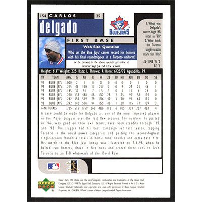 This is a 1999 UD Choice Carlos Delgado baseball card. The card is #154 and pictures show condition.