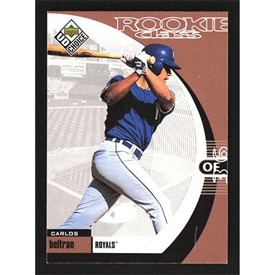 This is a 1999 UD Choice Carlos Beltran Rookie Class baseball card. The card is #9 and pictures show condition.