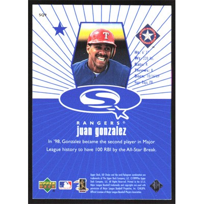This is a 1999 UD Choice StarQuest Juan Gonzalez baseball card. The card is #SQ9 and pictures show condition.