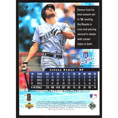 This is a 1999 UD Ionix Johnny Damon baseball card. The card is #33 and pictures show condition.