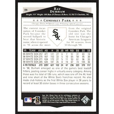 This is a 1999 Ultimate Victory Ray Durham baseball card. The card is #28 and pictures show condition.