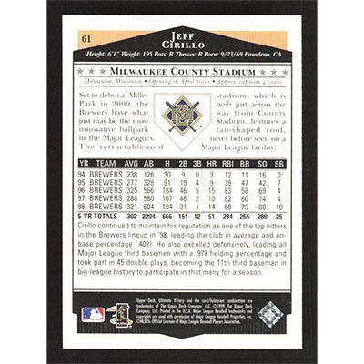 This is a 1999 Ultimate Victory Jeff Cirillo baseball card. The card is #61 and pictures show condition.