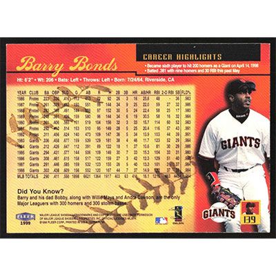 This is a 1999 Ultra Barry Bonds baseball card. The card is #139 and pictures show condition.