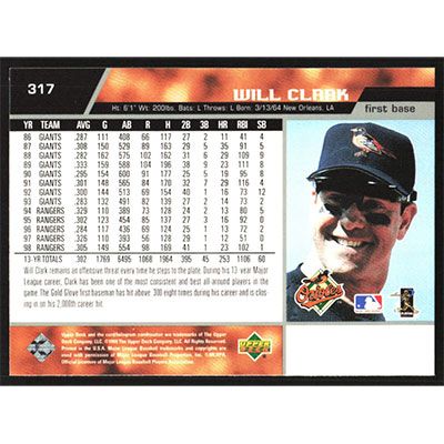 This is a 1999 Upper Deck Will Clark baseball card. The card is #317 and pictures show condition.