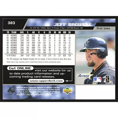 This is a 1999 Upper Deck Jeff Bagwell baseball card. The card is #383 and pictures show condition.