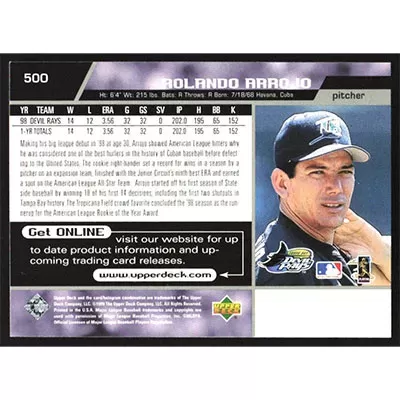 This is a 1999 Upper Deck Rolando Arrojo baseball card. The card is #500 and pictures show condition.